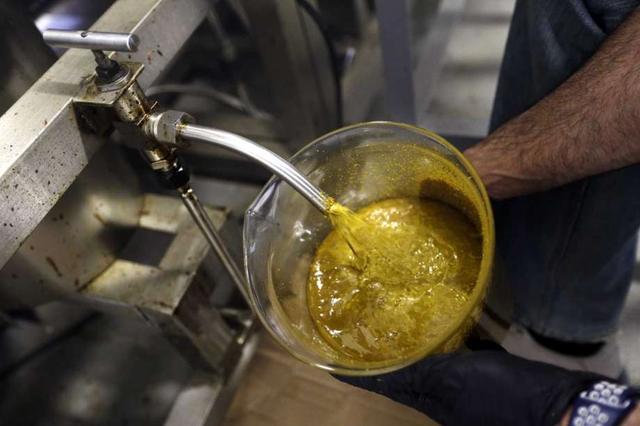 FILE--In this April 24, 2018, file photo, the first rendering from hemp plants extracted from a super critical CO2 extraction device on its' way to becoming fully refined CBD oil spurts into a large beaker at ... more