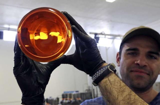FILE--In this April 24, 2018, file photo, Julian Cabrera, factory manager at New Earth Biosciences, holds up a large glass beaker containing thick, golden-colored, fully-refined CBD oil in Salem, Ore. The ... more