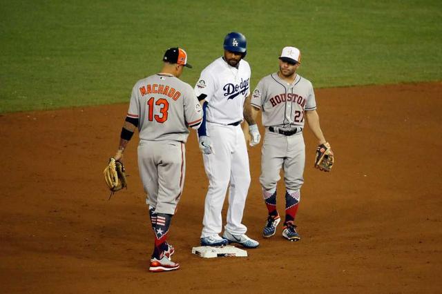 WASHINGTON, DC - JULY 17: Manny Machado #13 of the Baltimore Orioles and the American League and Jose Altuve #27 of the Houston Astros and the American League speak to Matt Kemp #27 of the Los Angeles Dodgers and the National League speak in the second inning during the 89th MLB All-Star Game, presented by Mastercard at Nationals Park on July 17, 2018 in Washington, DC. Photo: Patrick McDermott, Getty Images / 2018 Getty Images