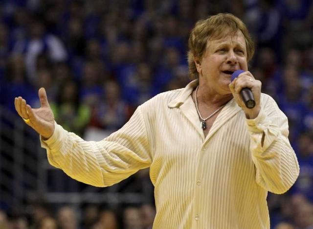 FILE - In this Jan. 25, 2010 file photo, Eddie Money sings the national anthem before an NCAA college basketball game between Kansas and Missouri in Lawrence, Kan. Family members have said Eddie Money has died on Friday, Sept. 13, 2019. less