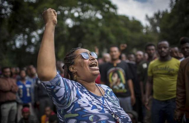 A woman shouts slogans as thousands of protestors from the capital and those displaced by ethnic-based violence over the weekend in Burayu, demonstrate to demand justice from the government in Addis Ababa, ... more