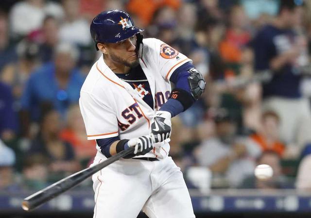 Houston Astros first baseman Yuli Gurriel (10) flies out in the first inning against the Toronto Blue Jays at Minute Maid Park on Wednesday, June 27, 2018 in Houston. Photo: Elizabeth Conley, Houston Chronicle / ©2018 Houston Chronicle