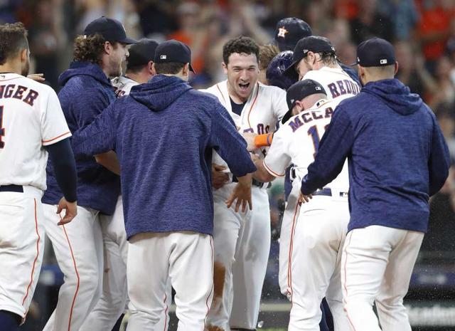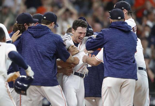 Houston Astros third baseman Alex Bregman (2) is mobbed by his teammates as they celebrate his two-run home run in the bottom of the ninth inning at Minute Maid Park on Wednesday, June 27, 2018 in Houston. Astros won the game 7-6/ Photo: Elizabeth Conley, Houston Chronicle / ©2018 Houston Chronicle