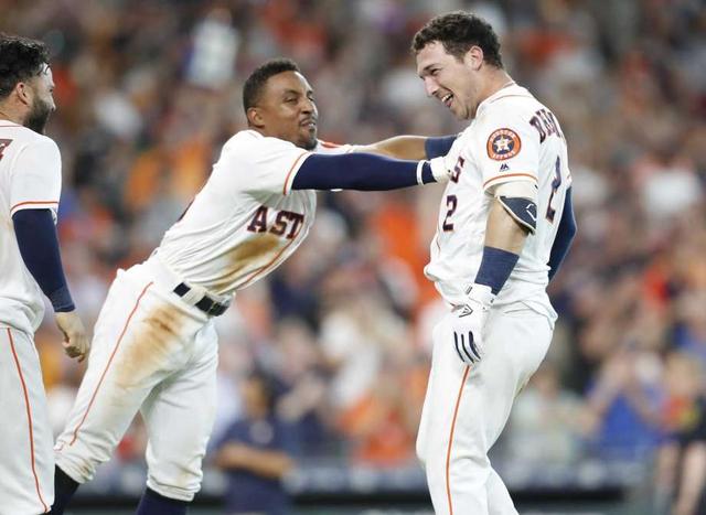 Houston Astros third baseman Alex Bregman (2) celebrates with Tony Kemp (18) after hitting a two-run home run and winning the game for the Houston Astros 7-6 in the bottom of the ninth inning at Minute Maid Park on Wednesday, June 27, 2018 in Houston. Photo: Elizabeth Conley, Houston Chronicle / ©2018 Houston Chronicle