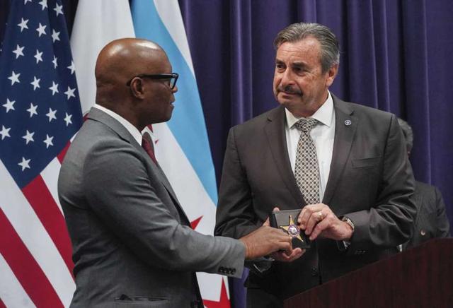 Interim Chicago Police Department Superintendent Charlie Beck, right, presents David Brown Sr., the acting superintendent, with the superintendent's badge at Beck's farewell ceremony Wednesday, April 15, 2020. Brown is a former Dallas police chief. (Annie Costabile/Chicago Sun-Times via AP) less