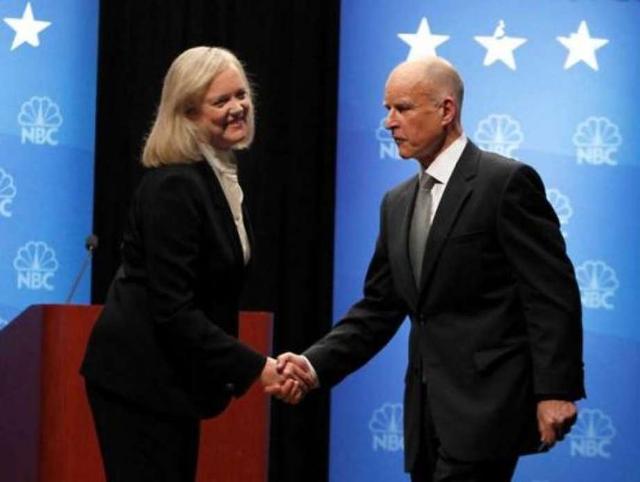 Then California Attorney General Jerry Brown (right) also invoked Goebbels in his successful 2010 gubernatorial campaign against Republican Meg Whitman (left), saying: “Goebbels invented this kind of propaganda. He took control of the whole world. She wants to be president. That's her ambition, the first woman president. That's what this is all about.” Brown later retracted the statement. less