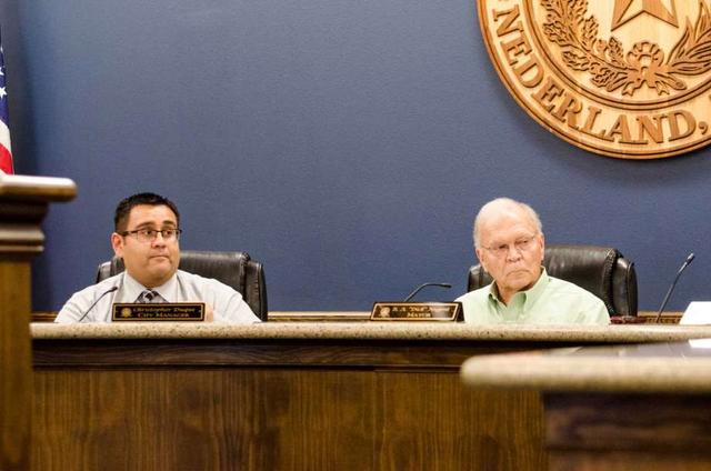 Nederland Mayor RA 'Dick' Nugent and City Manager Chrsitopher Duque discuss two project options concerning the reconstruction of Nederland Avenue in a Monday city council meeting. Photo taken Monday, ... more