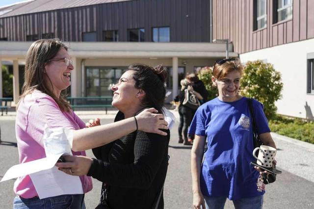 Nurses hug as they leave the Vilanova nursing home in Corbas, near Lyon, central France, Monday, May 4, 2020. For 47 days and nights, staff and the 106 residents of the Vilanova nursing home waited out the coronavirus storm together, while the illness killed tens of thousands of people in other homes across Europe, including more than 9,000 in France. Because staff and residents were locked in together, Vilanova didn't have to confine people to their rooms like other homes to shield them from the risk of infection brought in from outside. less
