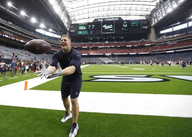 Houston Texans defensive end J.J. Watt tosses the ball to fans before the start of an NLF preseason game at NRG Stadium, Saturday, August 18, 2018, in Houston.