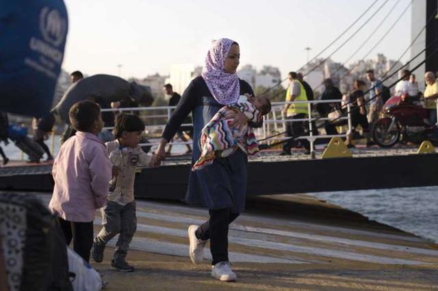 A Syrian woman with her children disembarks from a ferry, at the port of Piraeus, near Athens, Tuesday, Sept. 25, 2018. About 400 migrants and refugees arrived at the port from the island of Lesbos as ... more