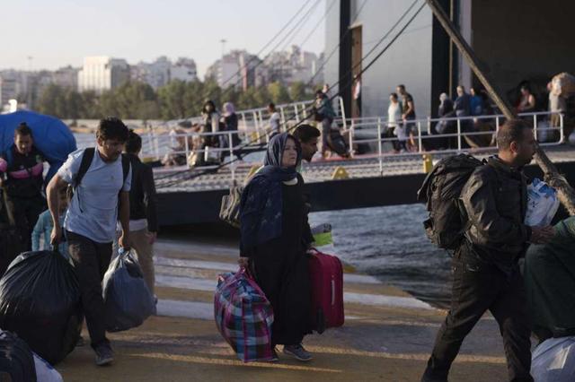 Refugees and migrants carry their belongings after they disembark from a ferry, at the port of Piraeus, near Athens, Tuesday, Sept. 25, 2018. About 400 migrants and refugees arrived at the port from the island ... more
