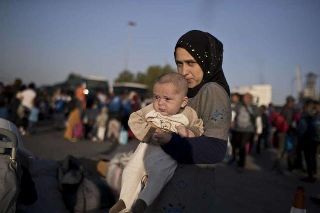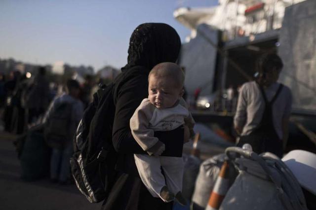 A Syrian woman holds her three month old baby Mohhamed Lousman after they disembark from a ferry, at the port of Piraeus, near Athens, Tuesday, Sept. 25, 2018. About 400 migrants and refugees arrived at the port from the island of Lesbos as authorities have been moving hundreds of migrants deemed to be vulnerable from the overcrowded Moria camp to camps on the mainland. less