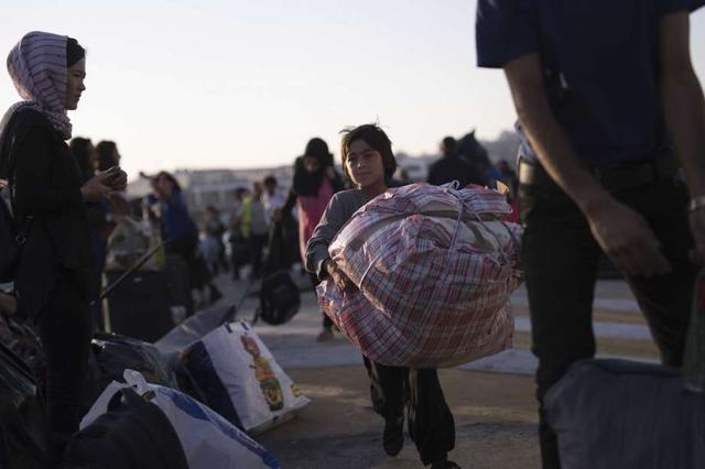 Refugees and migrants carry their belongings after they disembark from a ferry, at the port of Piraeus, near Athens, Tuesday, Sept. 25, 2018. About 400 migrants and refugees arrived at the port from the island of Lesbos as authorities have been moving hundreds of migrants deemed to be vulnerable from the overcrowded Moria camp to camps on the mainland. less