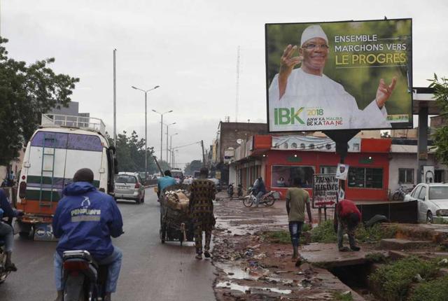 In this Wednesday, July 18, 2018 photo, motorbike taxis ride past a giant billboard of Malian Incumbent President, Ibrahim Boubacar Keita that reads "the great Mali advance" in Bamako, Mali. As deadly attacks by extremists become more brazen in Mali, officials and citizens fear this month's presidential election will be at risk from growing insecurity. Photo: Baba Ahmed, AP / Copyright 2018 The Associated Press. All rights reserved.