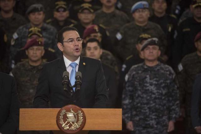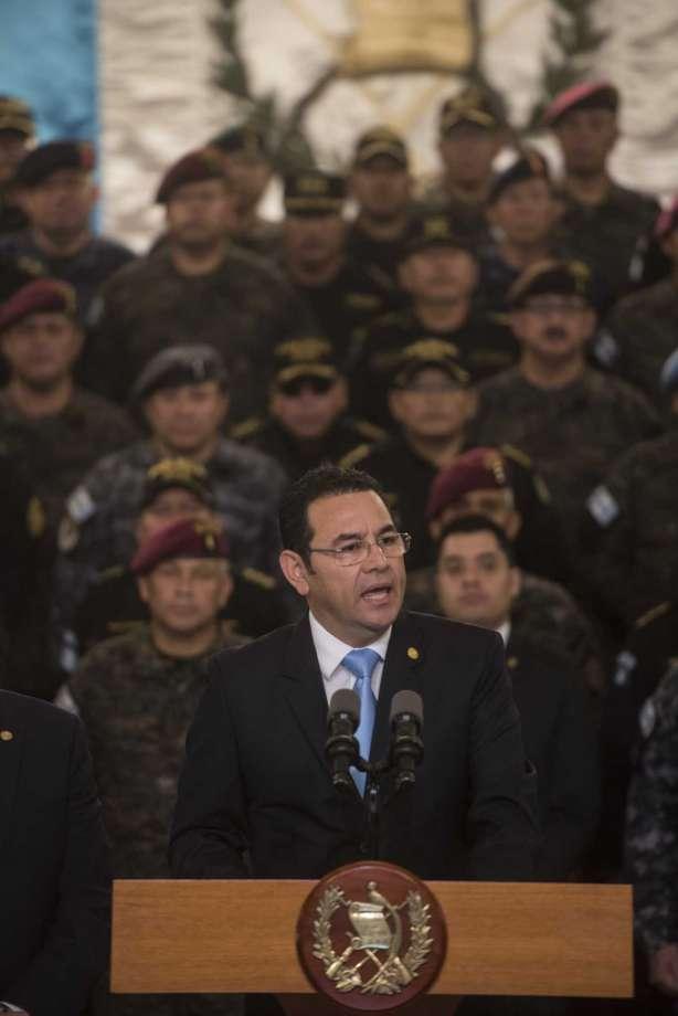 Guatemalan President Jimmy Morales speaks to the nation in a televised address, surrounded by military officers, in Guatemala City, Friday, Aug. 31, 2018. Morales said he is not renewing the mandate of a ... more
