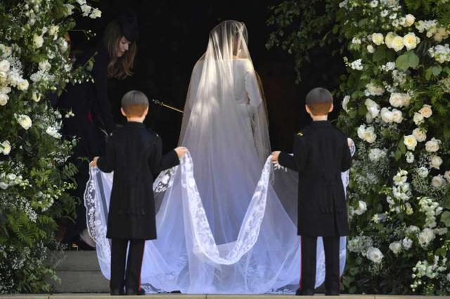 FILE - In this Saturday, May 19, 2018 file photo, Meghan Markle arrives for her wedding ceremony at St. George's Chapel in Windsor Castle in Windsor, near London, England. The outfits Prince Harry and Meghan ... more