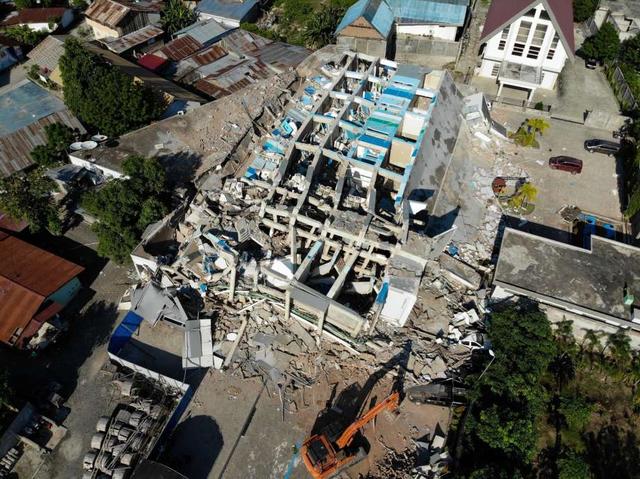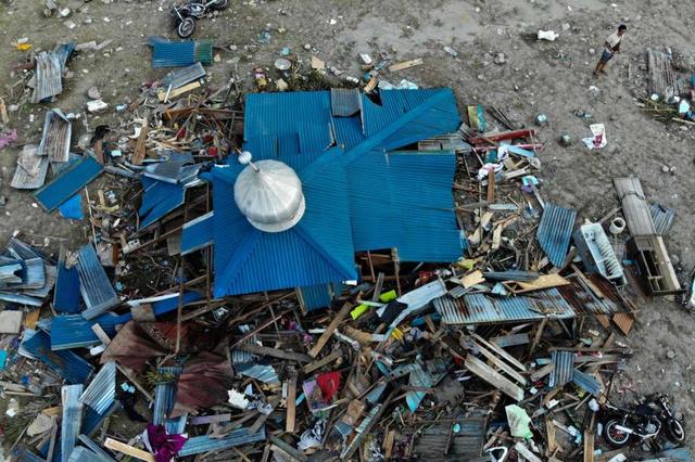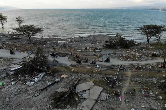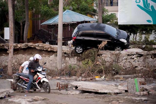 People drive past a washed up boat and collapsed buildings in Palu, Indonesia's Central Sulawesi on October 1, 2018, after an earthquake and tsunami hit the area on September 28. - The death toll from the ... more