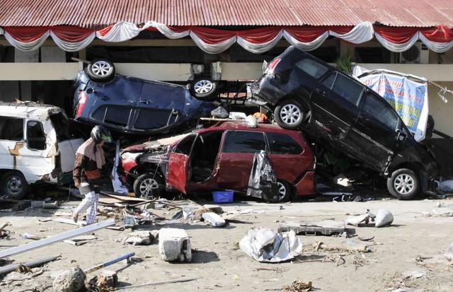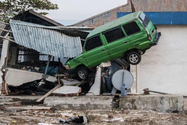 A man walks towards a car that has been completely flattened and pushed into a building by a tsunami, on October 01, 2018 in Palu, Indonesia. Over 844 people have been confirmed dead after a tsunami triggered ... more
