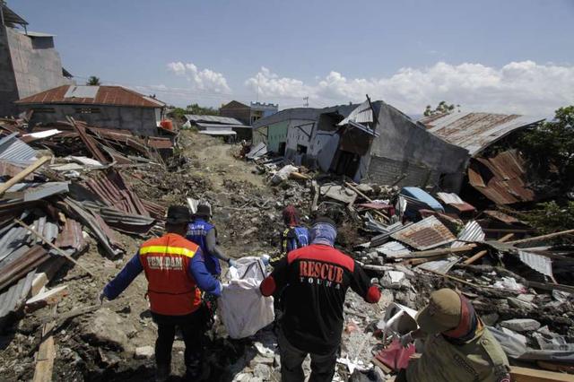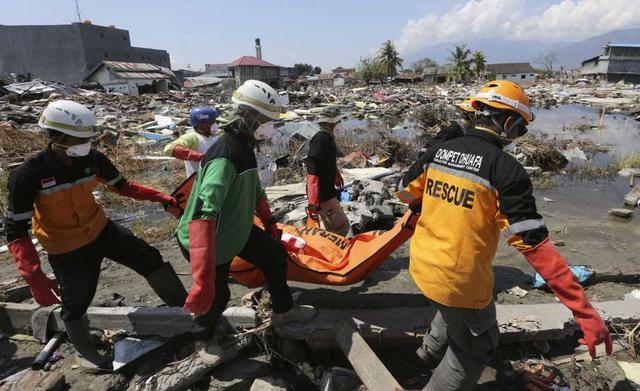 An Indonesian rescue team carries the body of a victim following an earthquake and tsunami in Palu, Central Sulawesi, Indonesia, Wednesday, Oct. 3, 2018. Aid was slowly making its way into areas devastated by ... more