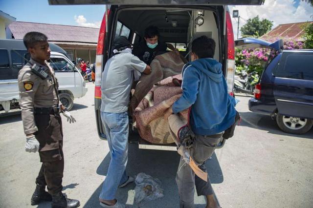 Officers bring the bodies of victims of the earthquake and tsunami in Palaroa village, in the city of Palu, Central Sulawesi, Indonesia on October 1, 2018. The death toll from the 7.7-magnitude earthquake and ... more
