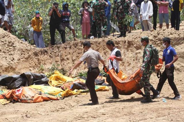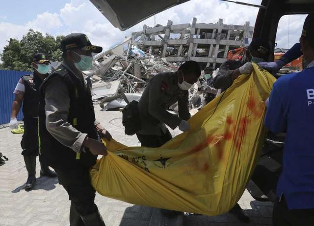 Officers bring the bodies of victims of the earthquake and tsunami in Palaroa village, in the city of Palu, Central Sulawesi, Indonesia on October 1, 2018. The death toll from the 7.7-magnitude earthquake and tsunami on the island of Sulawesi has risen to 1,203, the country's disaster management agency said on Sunday. less