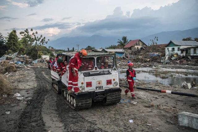 Rescue workers use a tracked vehicle to move through an area destroyed by a tsunami, on October 01, 2018 in Palu, Indonesia. Over 844 people have been confirmed dead after a tsunami triggered by a magnitude 7.5 earthquake slammed into Indonesia's coastline on the island of Sulawesi, causing thousands of homes to collapse, along with hospitals, hotels and shopping centers. Emergency services fear that the death toll could rise into the thousands as rescue teams made contact with the nearby cities of Donggala and Mamuju and strong aftershocks continue to rock the city. less