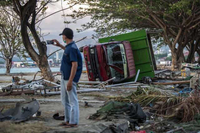 A man takes a photograph of a truck lying on its side after being hit by a tsunami, on October 01, 2018 in Palu, Indonesia. Over 844 people have been confirmed dead after a tsunami triggered by a magnitude 7.5 earthquake slammed into Indonesia's coastline on the island of Sulawesi, causing thousands of homes to collapse, along with hospitals, hotels and shopping centers. Emergency services fear that the death toll could rise into the thousands as rescue teams made contact with the nearby cities of Donggala and Mamuju and strong aftershocks continue to rock the city. less