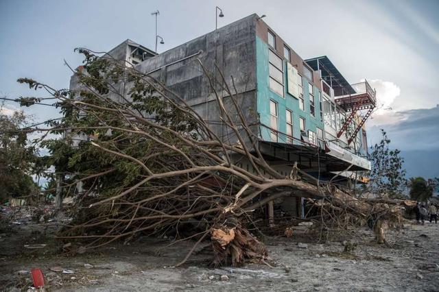 An uprooted tree sits beneath a building following a tsunami, on October 01, 2018 in Palu, Indonesia. Over 844 people have been confirmed dead after a tsunami triggered by a magnitude 7.5 earthquake slammed ... more