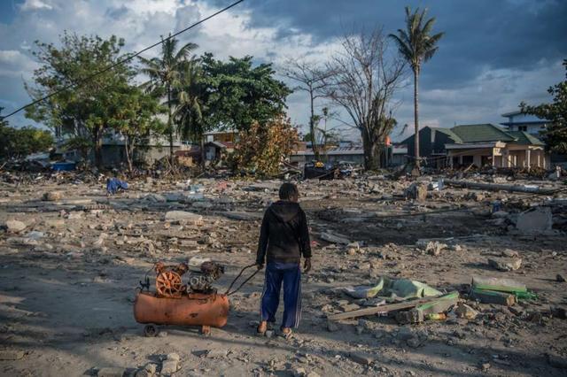 A man pulls an air compressor past the rubble of buildings destroyed by a tsunami, on October 01, 2018 in Palu, Indonesia. Over 844 people have been confirmed dead after a tsunami triggered by a magnitude 7.5 ... more