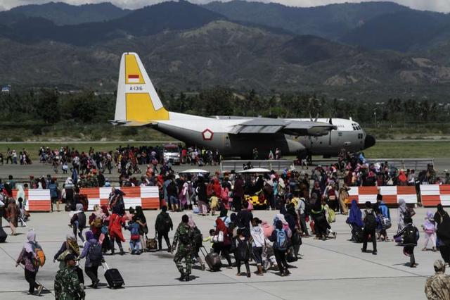 Residents queue to board a Hercules aircraft belonging to the Indonesian Air Force, as they are being evacuated after the earthquake and tsunami that hit the city, at Mutiara airport SIS Al-Jufrie, Palu, ... more