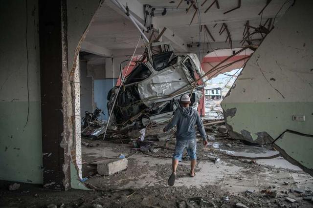 A man walks towards a car that has been completely flattened and pushed into a building by a tsunami, on October 01, 2018 in Palu, Indonesia. Over 844 people have been confirmed dead after a tsunami triggered by a magnitude 7.5 earthquake slammed into Indonesia's coastline on the island of Sulawesi, causing thousands of homes to collapse, along with hospitals, hotels and shopping centers. Emergency services fear that the death toll could rise into the thousands as rescue teams made contact with the nearby cities of Donggala and Mamuju and strong aftershocks continue to rock the city. less