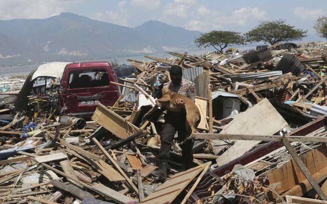 A police officer carries his K9 unit search dog as they continue to search for victims in the wreckage following earthquakes and tsunami in Palu, Central Sulawesi Indonesia, Wednesday, Oct. 3, 2018. Aid was ... more
