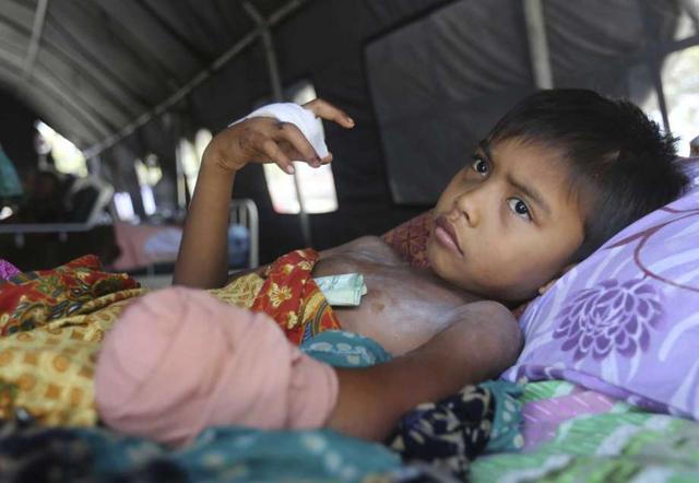 In this Wednesday, Oct. 3, 2018, photo, a child recovers after his left hand was amputated after being injured in the massive earthquake in Palu, Central Sulawesi Indonesia.
