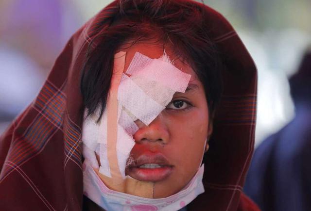 In this Wednesday, Oct. 3, 20-18, photo, an earthquake victim is bandaged at a makeshift hospital in Palu, Central Sulawesi Indonesia.