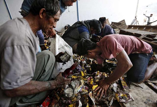 Men scavenge for food inside an abandoned warehouse in an earthquake and tsunami-affected area in Palu, Central Sulawesi, Indonesia Indonesia, Wednesday, Oct. 3, 2018. Clambering over the reeking pile of sodden ... more