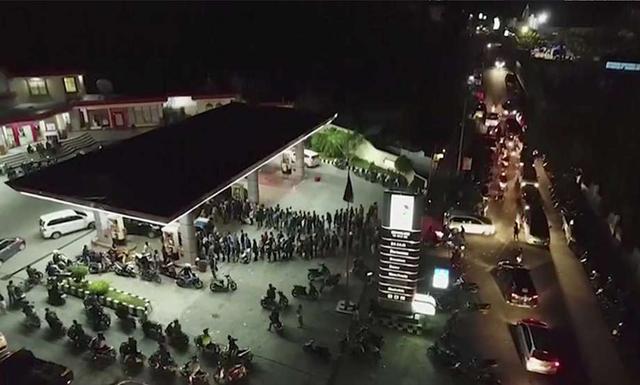 In this image made from drone video footage Tuesday, Oct. 2, 2018, long queues lead out from a petrol station in the earthquake and tsunami-devastated area of Palu, Central Sulawesi, Indonesia. Aid was slowly ... more
