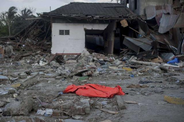 The body of a tsunami victim waits for evacuation at a village heavily damaged by Friday's earthquake and tsunami in Palu, Central Sulawesi, Indonesia Indonesia, Wednesday, Oct. 3, 2018. Aid is trickling into ... more