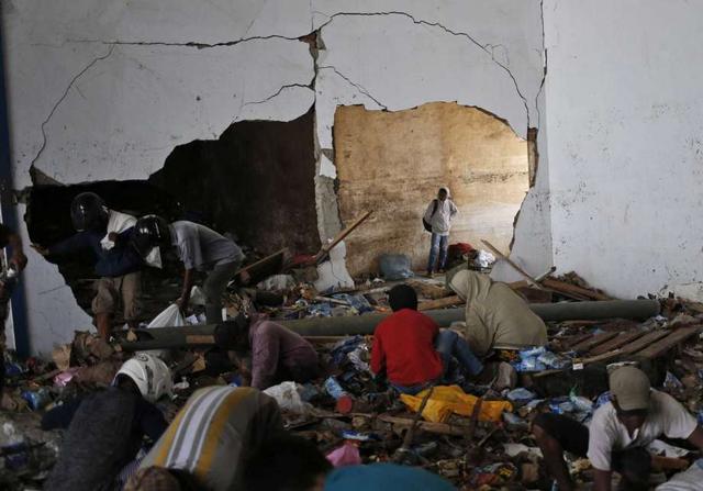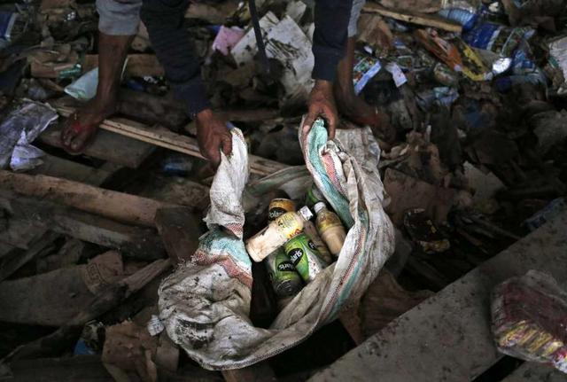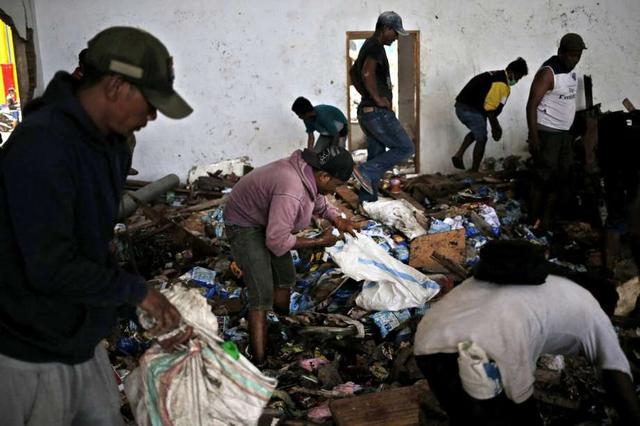 A man put beverages scavenged from an abandoned warehouse into a sack at an earthquake and tsunami-affected area in Palu, Central Sulawesi, Indonesia Indonesia, Wednesday, Oct. 3, 2018. Clambering over the ... more