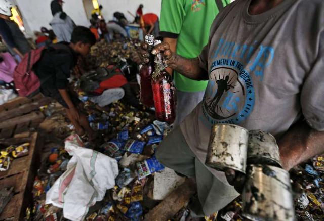 A man put beverages scavenged from an abandoned warehouse into a sack at an earthquake and tsunami-affected area in Palu, Central Sulawesi, Indonesia Indonesia, Wednesday, Oct. 3, 2018. Clambering over the reeking pile of sodden food or staking out a patch of territory, people who had come from devastated neighborhoods and elsewhere in the remote Indonesian city pulled out small cartons of milk, soft drinks, rice, candy and painkillers from the pile as they scavenge for anything edible in the warehouse that tsunami waves had pounded. less