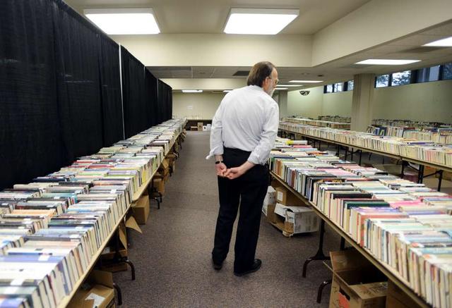 James Shoemaker, branch manager, walks between two tables full of books Wednesday afternoon. The Friends of the Library Book Sale will take place Friday and Saturday at the downtown branch library. About 10,000 ... more
