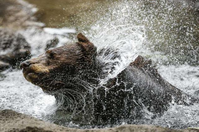 In this Wednesday, Aug. 29, 2018 photo, a black bear at the Houston Zoo shakes off water while swimming in its new enclosure in Houston. The updated Houston Zoo complex means about 6,000 square feet of room for ... more
