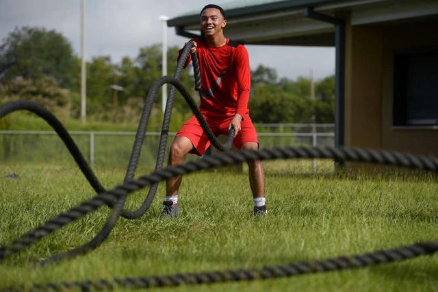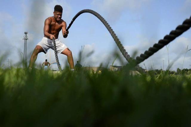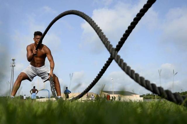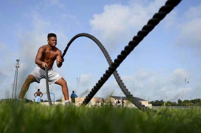 Beaumont United's Julius Rattler does rope swings during the football team's summer workouts. Photo taken Wednesday 7/18/18 Ryan Pelham/The Enterprise