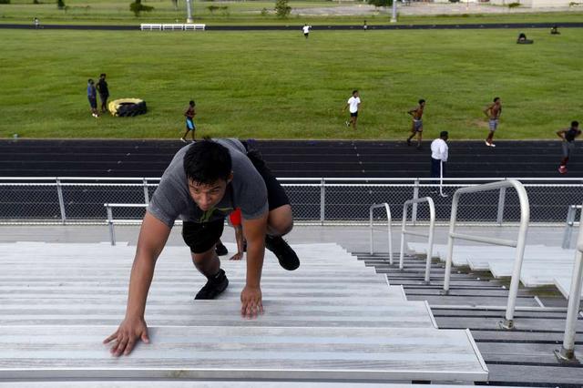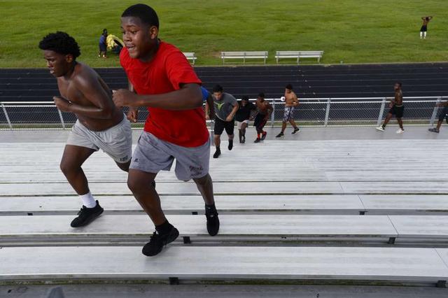 Beaumont United players run up the stadium stands during the football team's summer workouts. Photo taken Wednesday 7/18/18 Ryan Pelham/The Enterprise