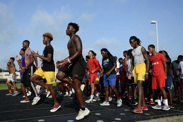 Beaumont United players warm up during the football team's summer workouts. Photo taken Wednesday 7/18/18 Ryan Pelham/The Enterprise