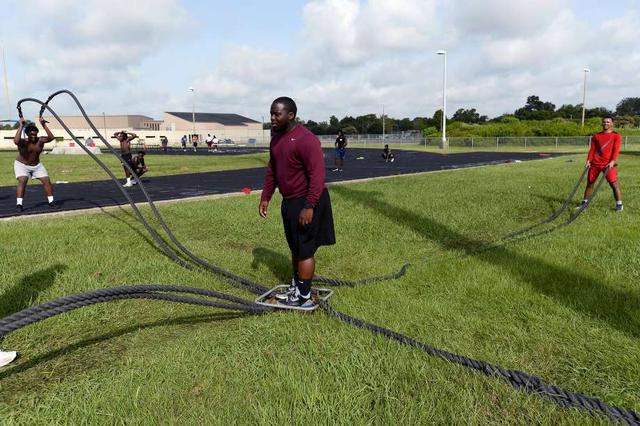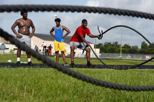 Beaumont United players compete to knock an assistant coach off balance while swinging ropes during the football team's summer workouts. Photo taken Wednesday 7/18/18 Ryan Pelham/The Enterprise