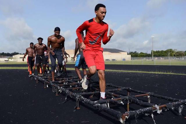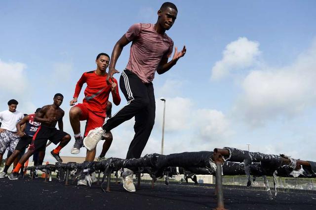 Beaumont United players do footwork drills during the football team's summer workouts. Photo taken Wednesday 7/18/18 Ryan Pelham/The Enterprise