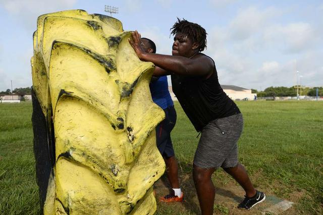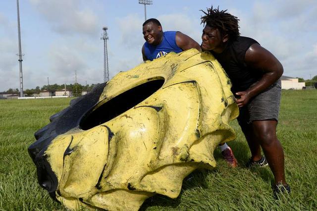 Beaumont United defensive tackles Jarvis Ferguson, left, and Jakevian Wilson flip a tractor tire during the football team's summer workouts. Photo taken Wednesday 7/18/18 Ryan Pelham/The Enterprise