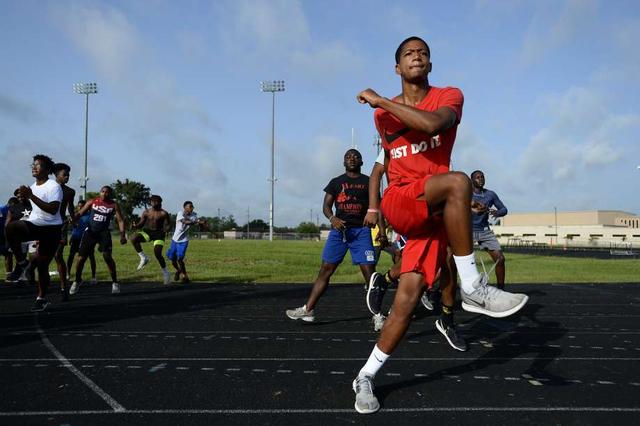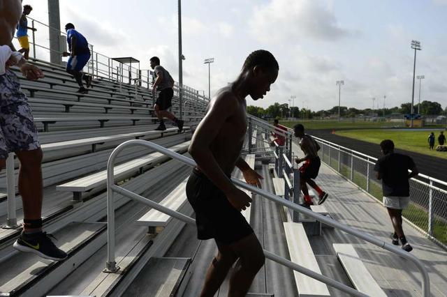 Beaumont United players run up and down the stadium stands during the football team's summer workouts. Photo taken Wednesday 7/18/18 Ryan Pelham/The Enterprise