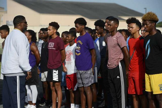Beaumont United assistant coach Kirby Jones talks with players during the football team's summer workouts. Photo taken Wednesday 7/18/18 Ryan Pelham/The Enterprise