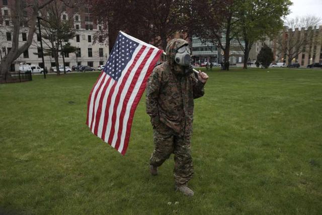 A protester carries an American flag while wearing a gas mask during a rally at the State Capitol in Lansing, Mich., Thursday, May 14, 2020. People angry over Michigan's coronavirus stay-at-home order protested outside the state Capitol on Thursday, braving heavy rain to call for business owners to reopen in defiance of Gov. Gretchen Whitmer. less